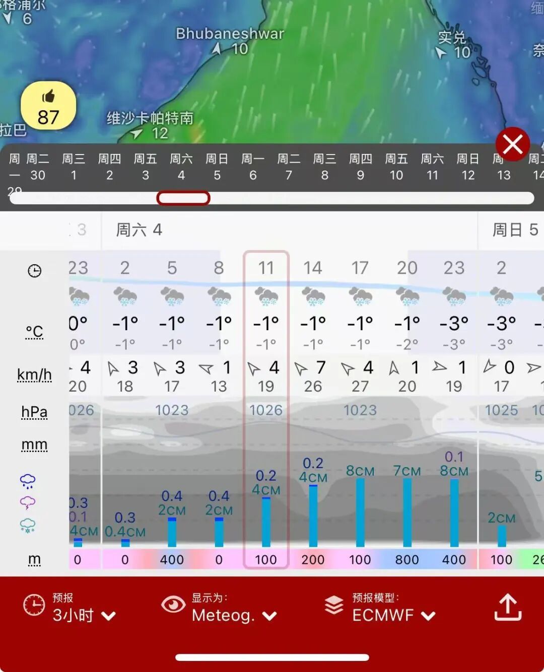 立夏在行前至少三四天做的天气预测。预测显示雪量最高会出现在4号早上5点以后,每小时8cm的降雪量。 图/受访者 立夏提供