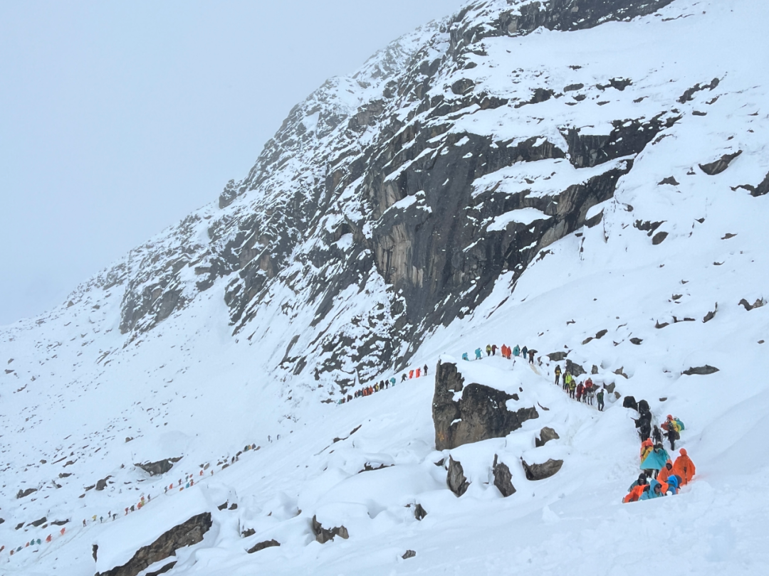 在安荣下了一个很大的流石坡,又上了一个很大的坡后,山里又开始下雪,而且还刮着大风。安荣说:“从这个时候开始,雪就基本没停过了。“这个时候是4号下午两三点钟左右,安荣与其他领队当即意识到这场雪不会小了。