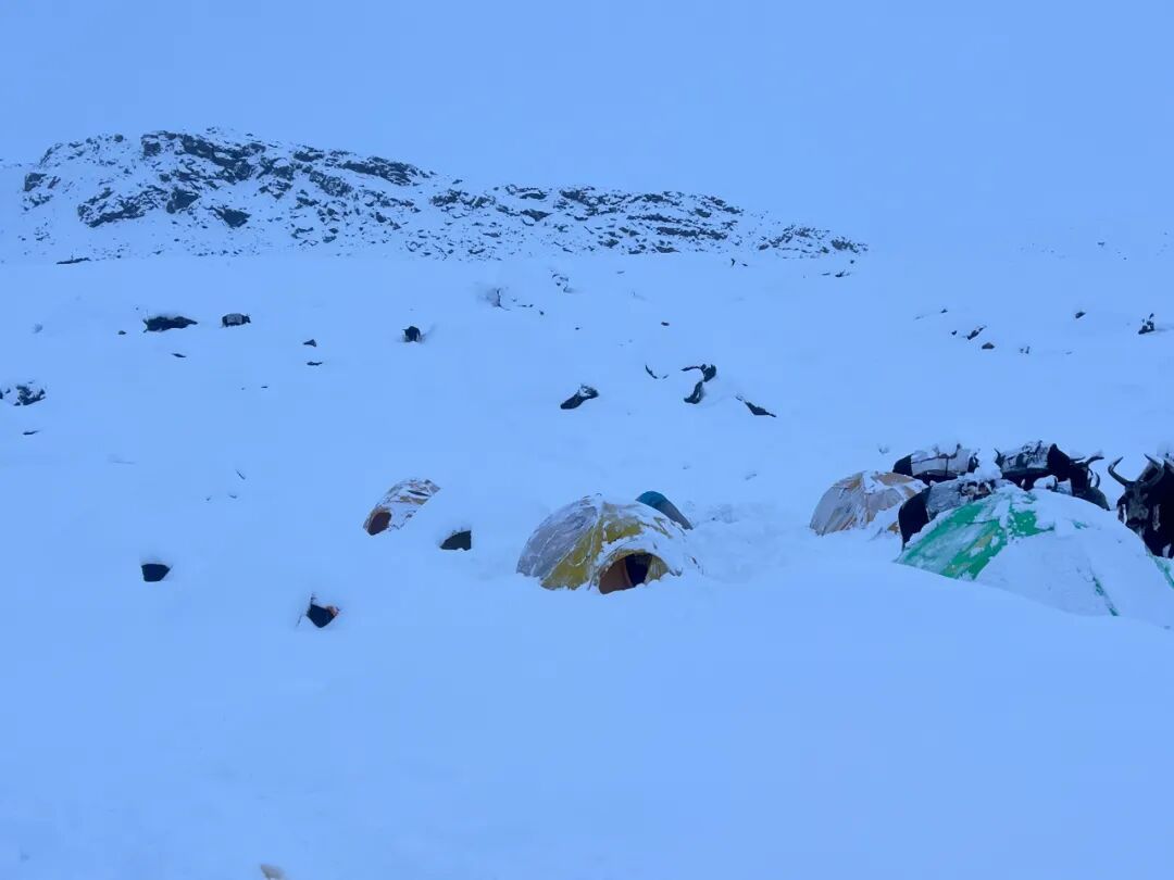虽然之后雪又停了再下,但已经不算很大。安荣说:“之前是一直持续在下的,从4号早上下到5号早上,也就是说持续了可能有二三十个小时。”他接着说:“5号早上起来的时候那个雪有多深呢?(积雪高度)基本能和躺在帐篷外睡觉的牦牛持平。”