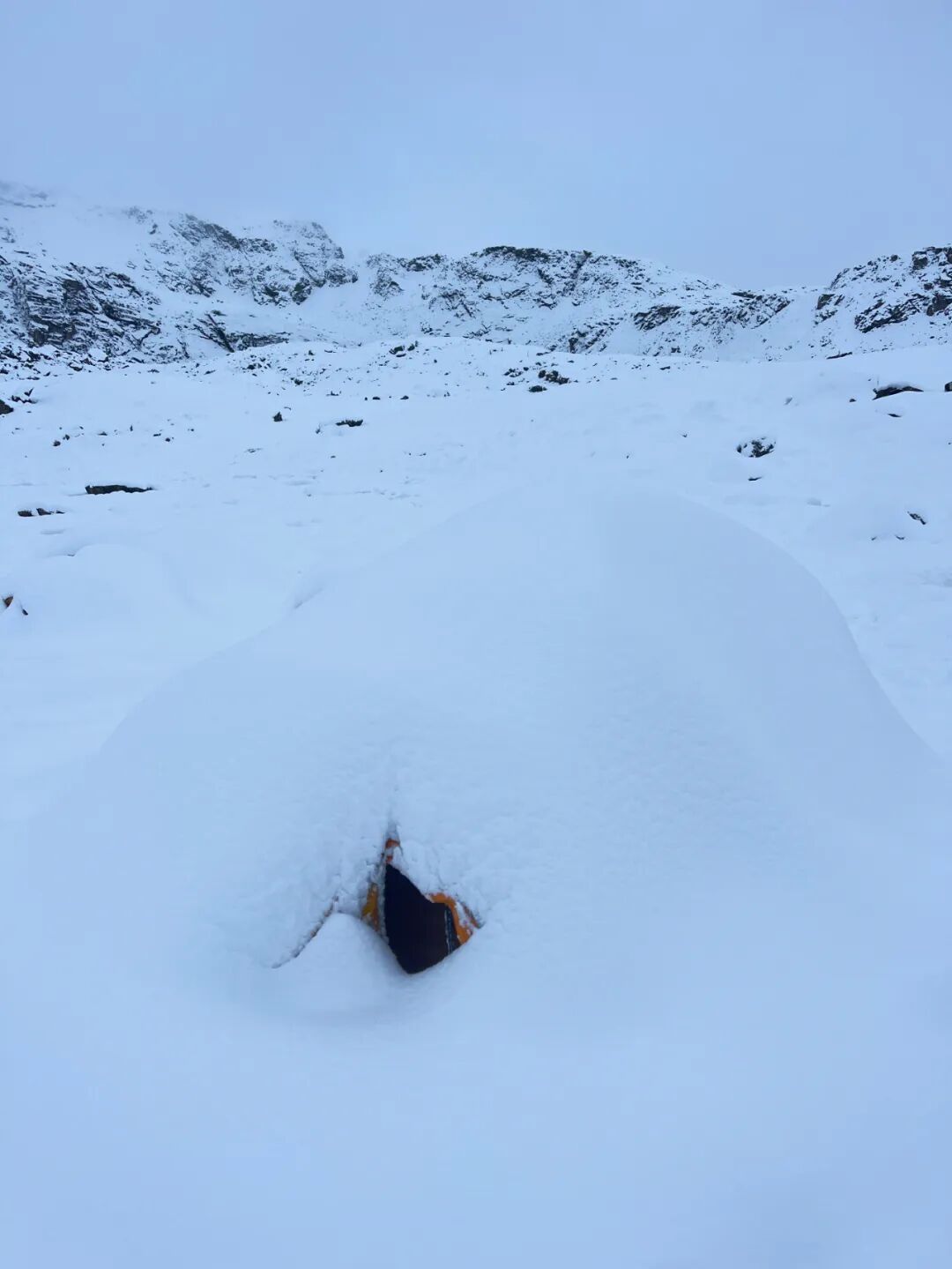 暴雪后的帐篷基本已被掩埋。“我拍了几张照片基本是看不出来它是帐篷的,你只能看到一个小雪包在那。”安荣说。 图/受访者 安荣同学提供